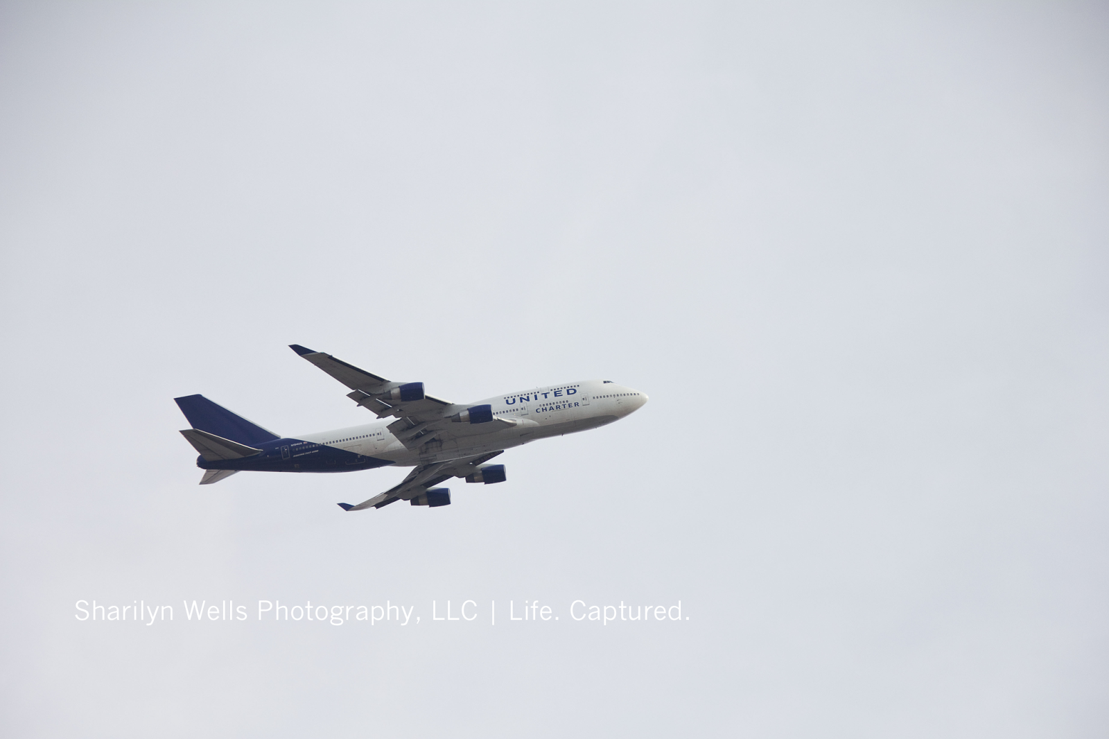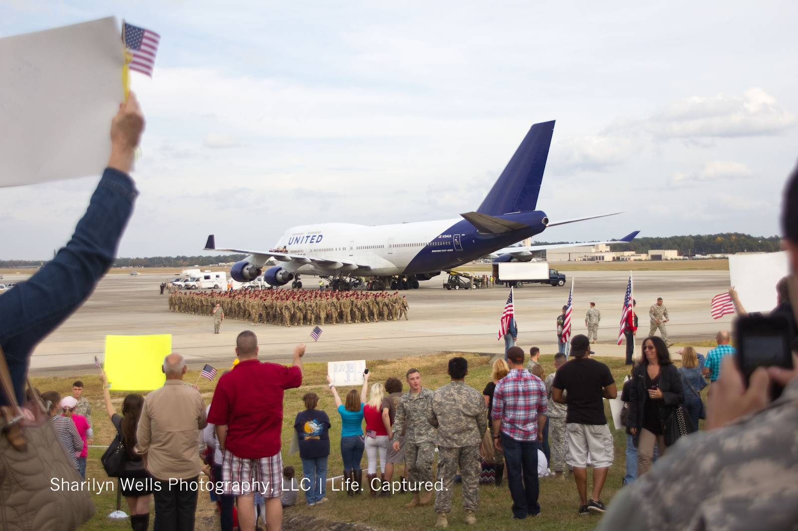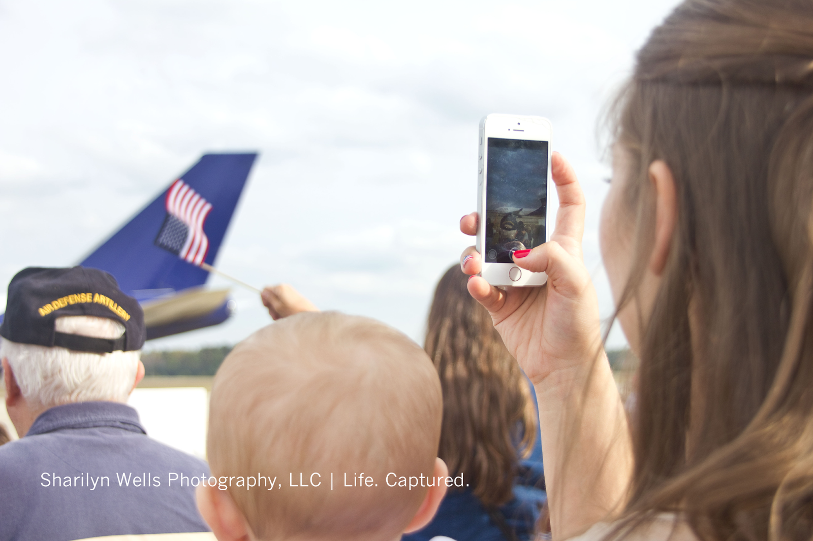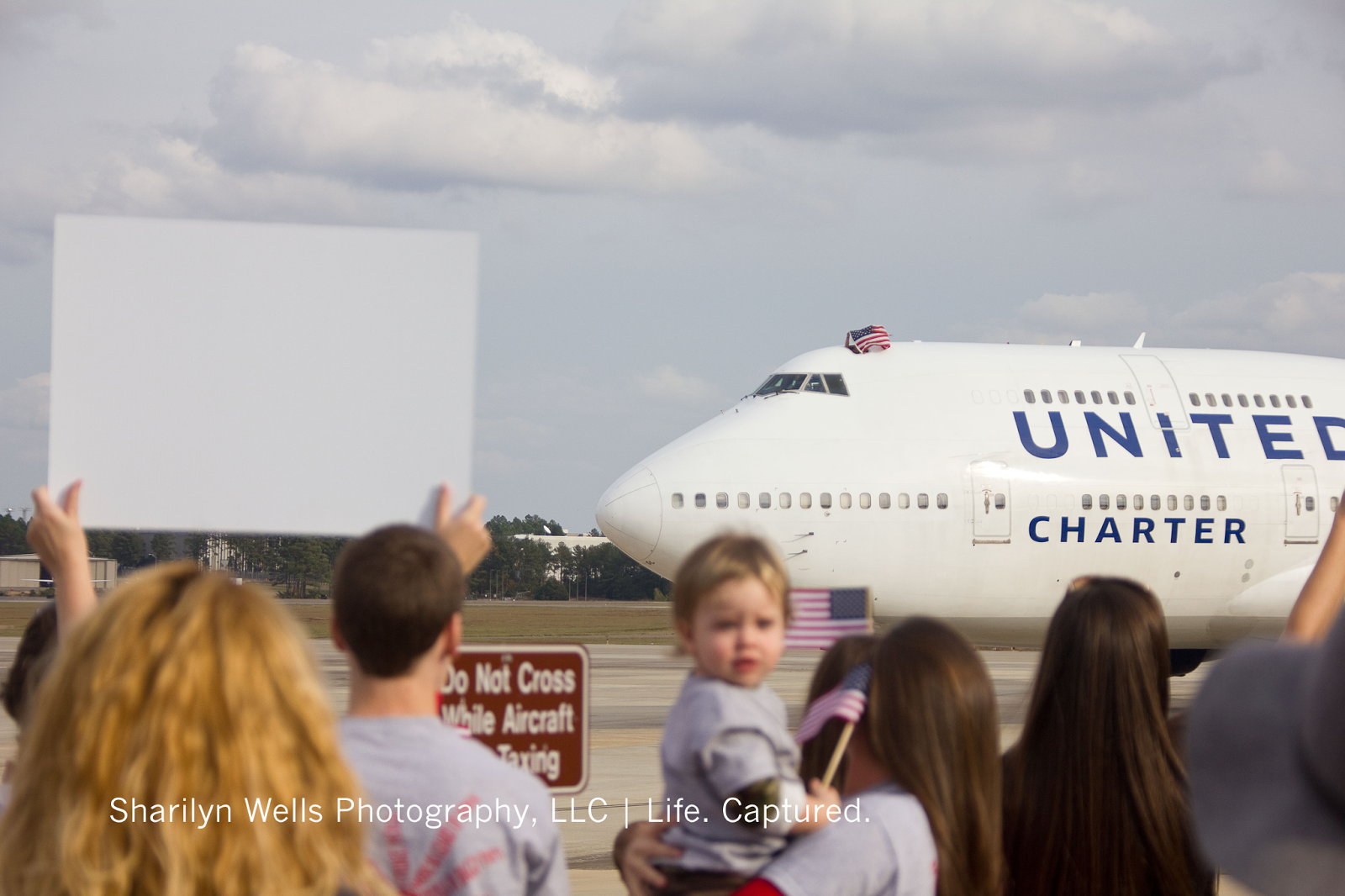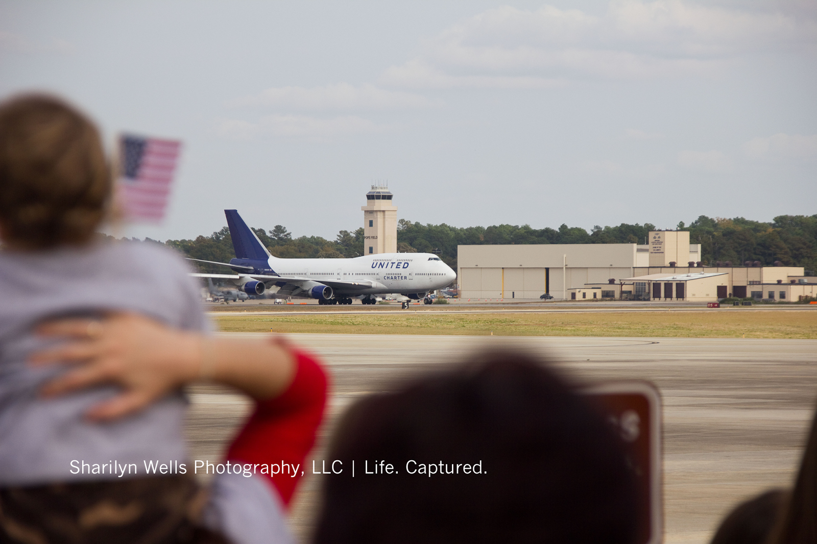And then there's usually the "first time ever" stories of my homecomings ... there's usually a first ever in 3 outta 5 homecomings I do! This family's homecoming first time ever was the plane. No, not that it was an actual civilian plane ... I've seen United fly into Pope Air Field multiple times ... but well, it was the way they kinda did a fly by for the crowd. Now, I don't know if they miss read the flight line and just missed it, or if they were actually doing a fly by. But they got low to the flight line, and then lifted, zooming right over our heads!