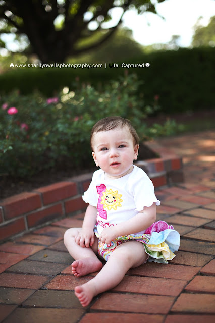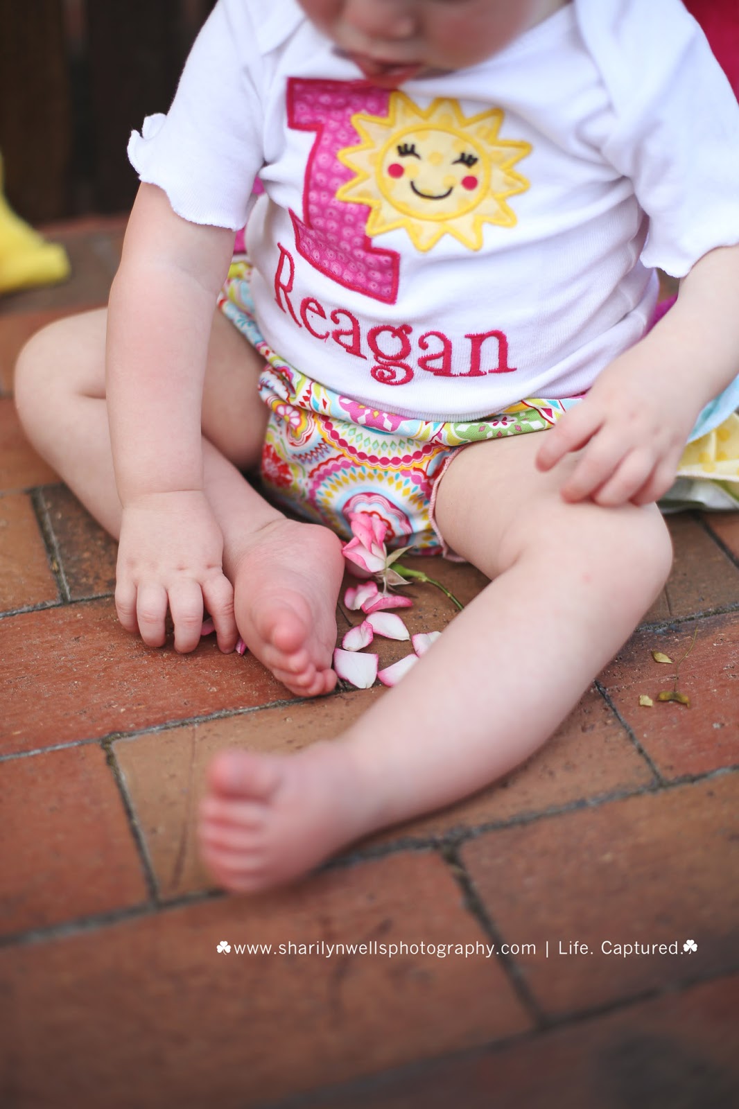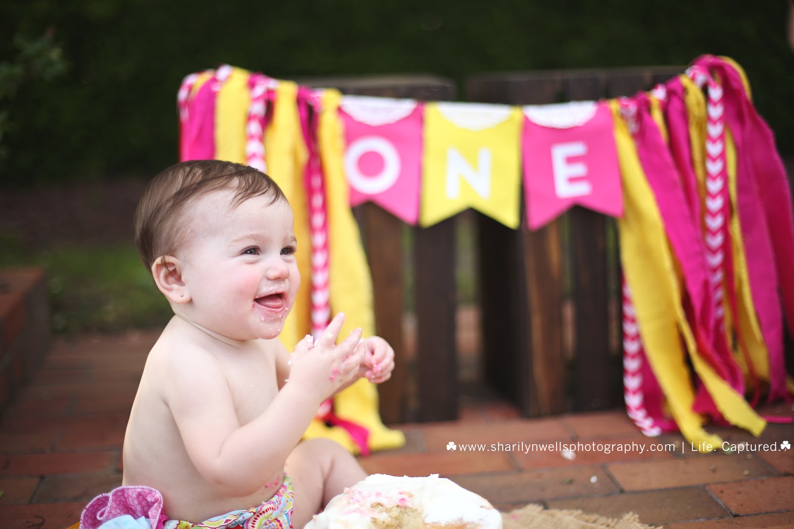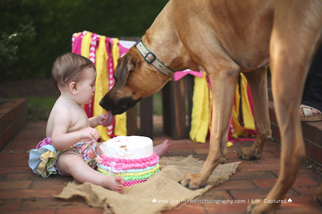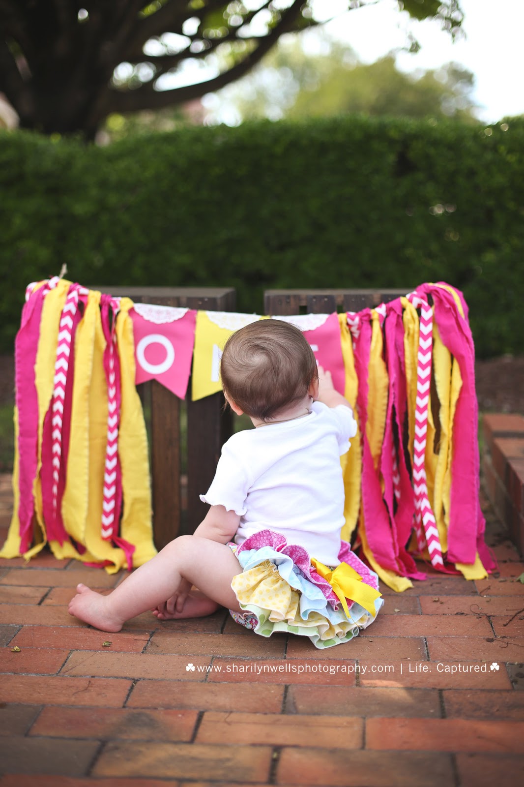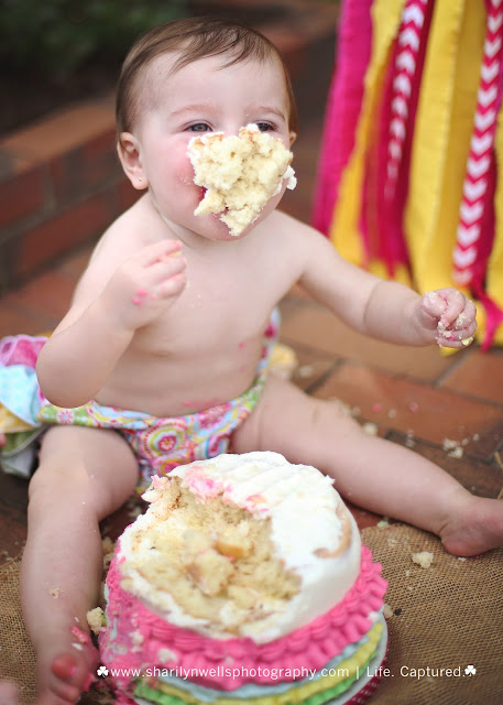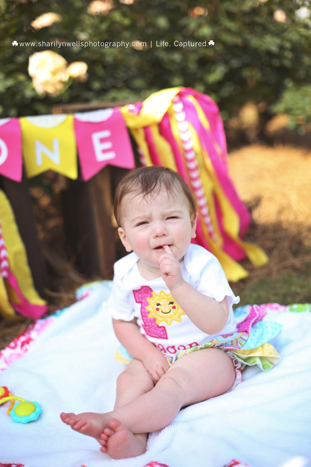 Okay .... so at first we weren't too happy about turning one. I mean, one is a pretty big event. You've been on this earth for 12 months ... 365 days ... and LOTS of hours. I mean, it's a pretty big deal. You're still learning things, like, "what is this pretty pink and yellow thing?" "Why did mom put me in these ruffles?" "Oh ... what is this?" "Its pink, soft and smells amazing..." "Why is this woman in front of me with that big thing and making funny noises?"