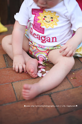 LOL, little miss was not to keen on me having her in the early evening heat, on grass, then a blanket, then brick trying to photograph her. So in between her little sobs, I caught detail images and parts where it didn't look like she was crying ... lol. We finally decided to stop torturing her and give her the cake. After all, she deserved it! Heck, she earned it!