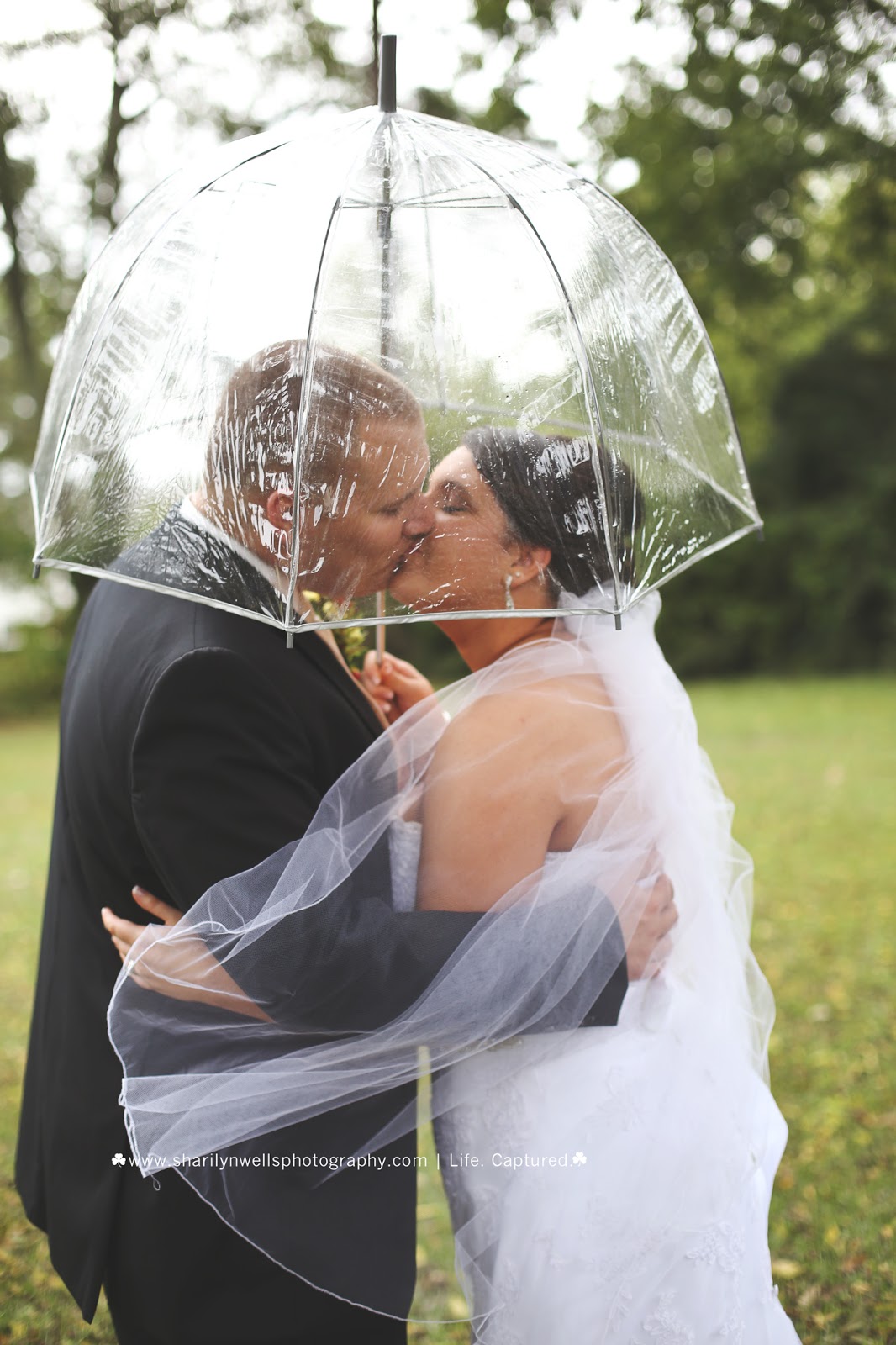 Because rain was so imminent, I made sure to bring clear umbrellas ... but by the time it came for photos, it was so sunny it wasn't needed. But by golly, I wanted to use those umbrellas. So I made the bride and groom do at least one kissing photo! ;)